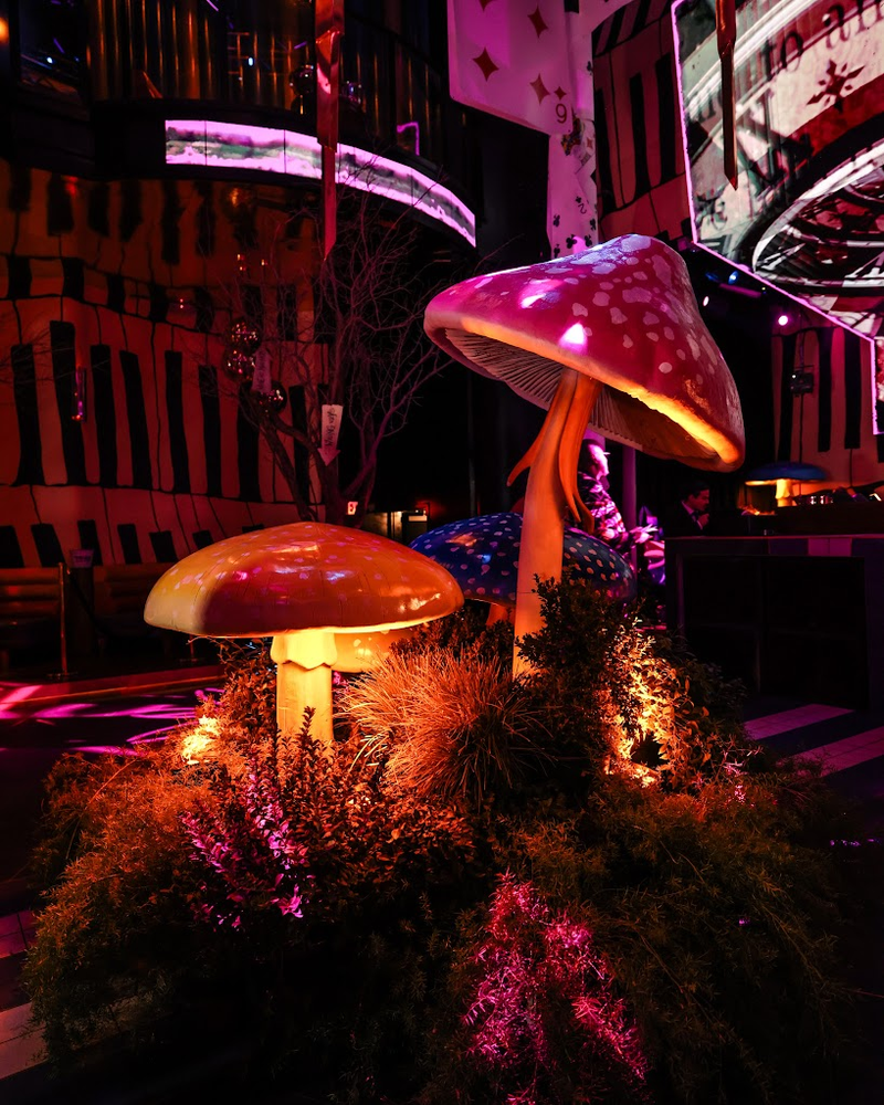 "After the keyhole, you enter into the Mad Forest, we had bare trees with spiky branches everywhere and in the middle of the club," Earles says. "There was a forest-like section with all different types of massive mushrooms growing out of the floor."